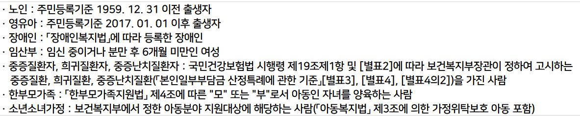 주민등록표 등본 상 본인이 기초생활수급자이거나 가구 내 세대원이 노인, 영·유아, 장애인, 임산부, 중증·희귀·중증난치질환자, 한부모가족, 소년소녀가정(가정위탁보호 아동 포함)이 있는 경우