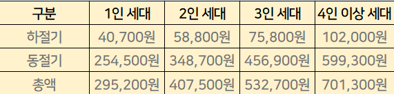 세대원수를 고려하여 세대당 금액을 차등을두어 지급합니다. 세대원수의 산정은 주민등록표 등본에 포함하는 세대원으로 결정하고 에너지 바우처 지원금액은 수급자의 산정소득에 반영되지 않습니다.